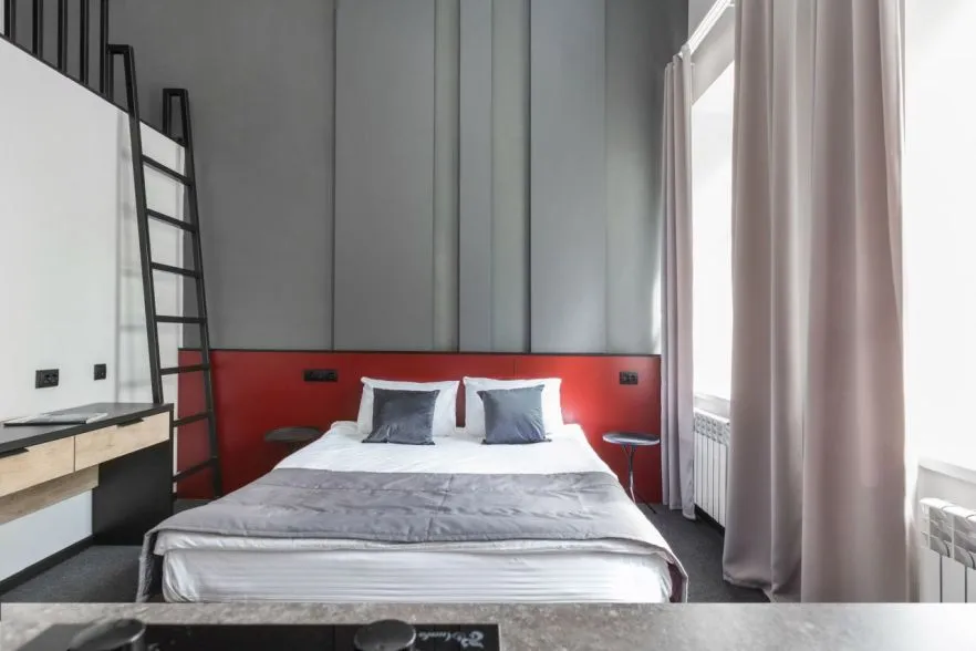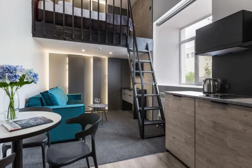Стильная студия для 2-4 гостей. Площадь 18 кв.м. Вместимость – 4 гостя Двуспальная кровать на верхнем уровне Раскладной диван на нижнем уровне Бесплатный Wi-Fi Телевизор Мини-кухня с кухонными принадлежностями Душ и туалет